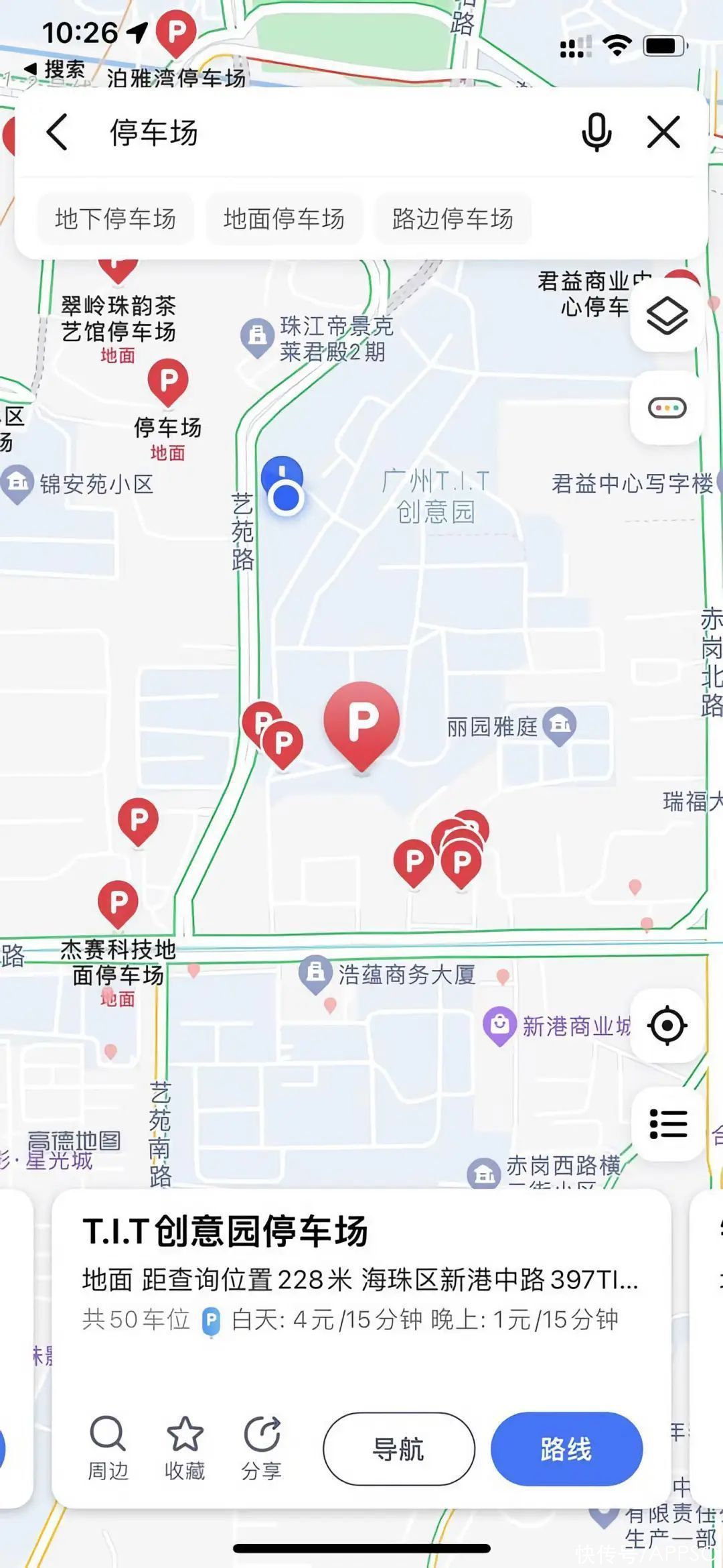 与传统导航相比,结合了真实物理环境的 AR 导航所显示的信息要更为直观,易读性也更强,很适合那些经常在快速路上错过出口的朋友(比如我的同事金金)。唯一有点小麻烦的是,你需要一个合适的手机支架,来确保手机摄像头朝向正前方。除了 AR 导航,找停车场的时候,地图 app 还可以给我提供目的地附近停车场的停车价格。每天上班,下图中这个 4 元/15 分钟的停车场我是绝对不会进去的,除非哪天发达了。
