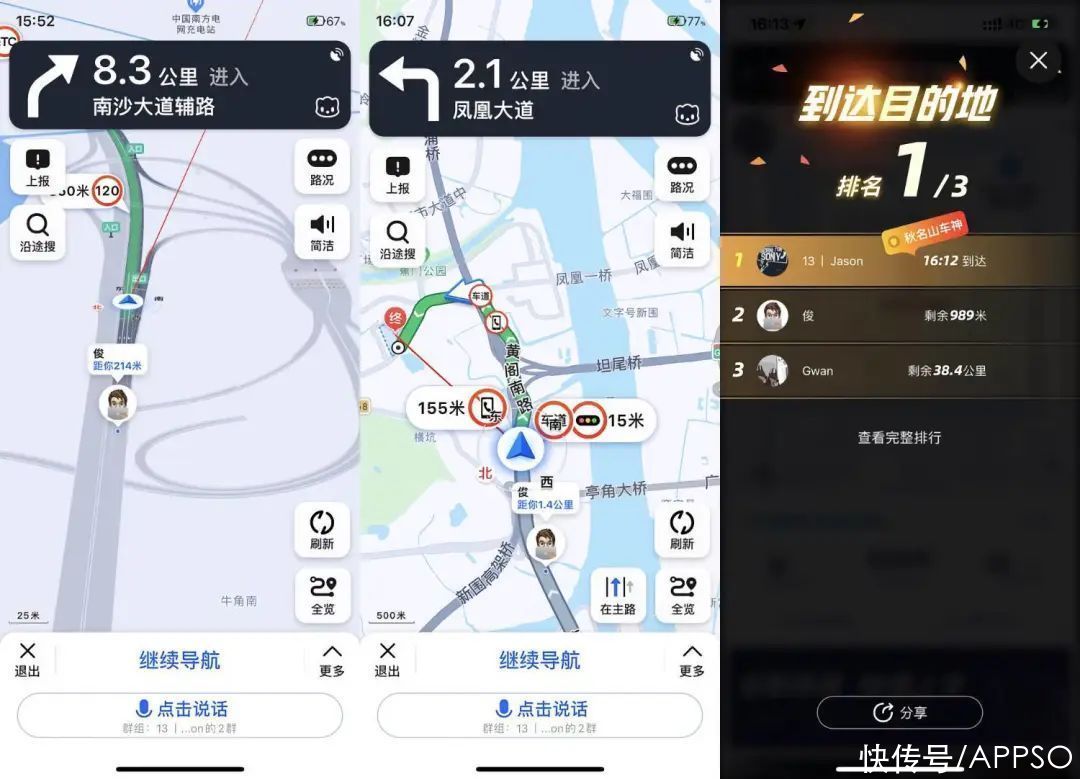 如果在《高德地图》中设置了目的地导航,在抵达目的地后,还会生成一张「成绩单」来记录你的耗时和距离,然后在组队成员里进行排名。嗯,有秋名山那味儿了(公开道路请勿飙车哦)。
